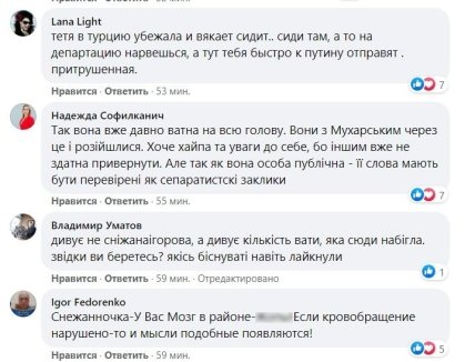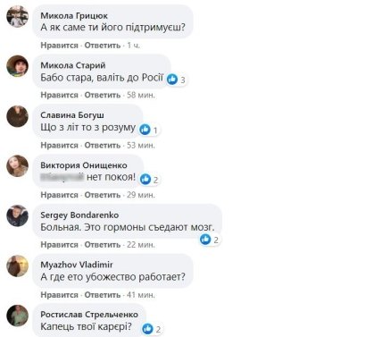 "Чого тоді ти тут в Україні сидиш, таких як ти вивозити до Сибіру. Їдь до Путіна і там його підтримуй! Ганьба, що влада дозволяє таким зрадникам перебувати в країні"