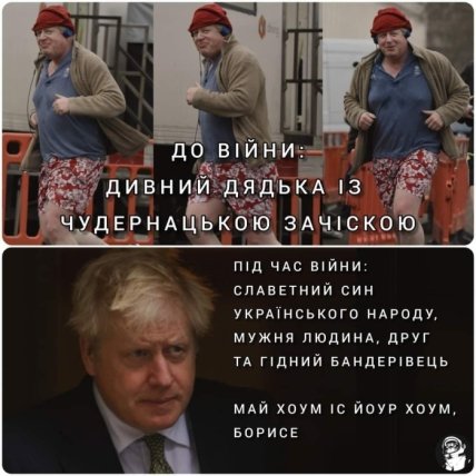 Попри те, що з візиту прем’єр-міністра Великої Британії Бориса Джонсона до Києва пройшов майже місяць, у мережі кількість смішних відео, картинок та жартів меншою не стала, а навіть навпаки. Британський політик став одним із найактуальніших і найпопулярніших героїв кумедних мемів. Зазначимо, що всі приколи добрі та позитивні.