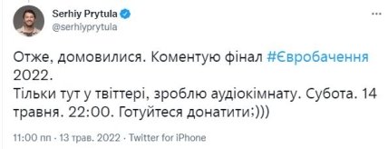 upd: Пізніше Притула повідомив, що готовий коментувати конкурс і повідомив час та місце