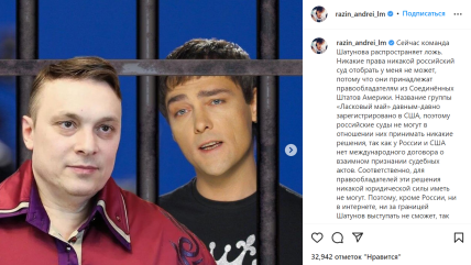 Як би не було, минулого тижня Ставропольський суд визнав: виняткові права на пісні гурту "Ласковый май" належать одному з колишніх учасників колективу Юрію Шатунову. Разін одразу ж відповів: оскаржить таке рішення. Експродюсер Шатунова погрожував від арешту майна співака до притягнення до кримінальної відповідальності. До речі, сам Разін зараз перебуває в США, а гурт "Ласковый май", як і він, у списку санкцій в Україні.