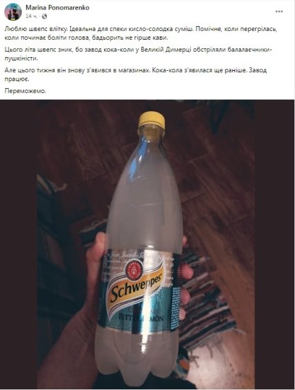 "Цього літа швепс зник, бо завод кока-коли у Великій Димерці обстріляли балалаєчники-пушкіністи. Але цього тижня він знову з’явився в магазинах. Кока-кола з’явилася ще раніше. Завод працює. Переможемо", — йдеться у публікації.