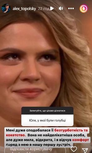 Фанати Топольського запитали його у сторіс-Інстаграм, чи сподобалася йому дівчина Юлія, яка прийшла на проєкт із червоною каструлею голубців. Нагадаємо, що дівчина є директором бенкетної служби.