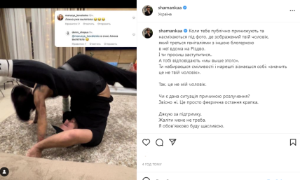 Новину про намір розлучитися Шаманська повідомила на своїй сторінці в Інстаграм у неділю, 8 січня. До публікації вона прикріпила знімок, де її чоловік зображений у пікантній позі з іншою блогеркою. Судячи з усього, йдеться про Анну Алхім.