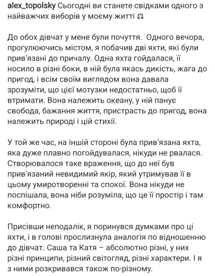 "Присівши неподалік, я поринув думками про ці яхти, і в голові прослизнула аналогія по відношенню до дівчат. Саша і Катя — зовсім різні, у них різні принципи, різний світогляд, різні характери. І я з ними розкривався теж по-різному", — пише Алекс.