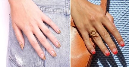 Популярніший, мабуть, усе-таки перший варіант — вертикальний половинчастий манікюр. Він не тільки прекрасно виглядає на нігтях, а й візуально звужує та подовжує нігтьову пластину, роблячи пальчики більш витонченими. Другий варіант – з горизонтальними половинками – більше нагадує класичний френч. Головна відмінність у тому, що яскравий "кінчик" у цьому варіанті займає чималу частину нігтя.