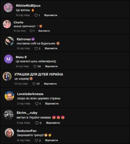 "Всі бісячі пісні у вашому виконанні стають прекрасними", "Як швидко хлопчик виріс", "Ця версія набагато краща", "Нарешті виконання, яке мене не напрягає", "Найкращий кавер", "Метал в Україні оживає", "Поставлю собі на будильник", "Це шедевр", "Скоро у всіх церквах країни", "Закривайте тренд!" — серед іншого, пишуть у коментарях.