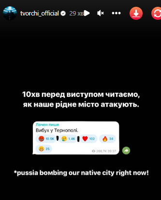 "За 10 хвилин перед виступом читаємо, як наше рідне місто атакують. Це відбувається зараз", — написали хлопці у сторіс. Також гурт опублікував пост зі словом Ternopil на чорному тлі.