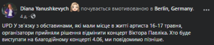 "У звʼязку з обставинами, які мали місце в житті артиста 16-17 травня, організатори прийняли рішення відмінити концерт Віктора Павліка. Хто буде виступати на благодійному концерті 4.06, ми повідомимо пізніше", — написала Янушкевич у Фейсбуці.