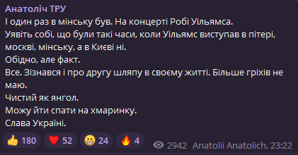 "Уявіть собі, що були такі часи, коли Уільямс виступав в пітері, москві, мінську, а в Києві ні. Обідно, але факт. Все. Зізнався і про другу шляпу в своєму житті. Більше гріхів не маю", — поділився з фоловерами Анатолій Анатоліч.