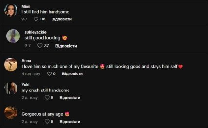"Я досі знаходжу його красивим", "Все ще виглядає добре", "Приголомшливий у будь-якому віці", "Мій краш досі красивий", "Дуже його люблю, один з улюблених акторів. Досі виглядає добре і залишається самим собою", — серед іншого, пишуть у коментарях.