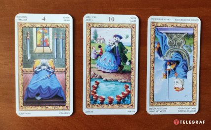 Зліва направо — Четвірка мечів, Десятка кубків, перевернута Королева мечів