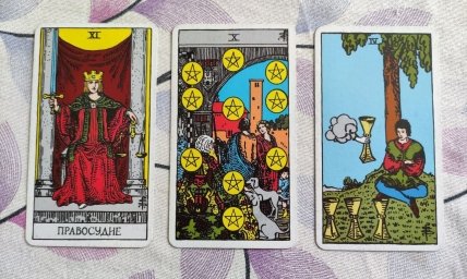 Зліва направо — Правосуддя, Десятка пентаклів, Четвірка кубків