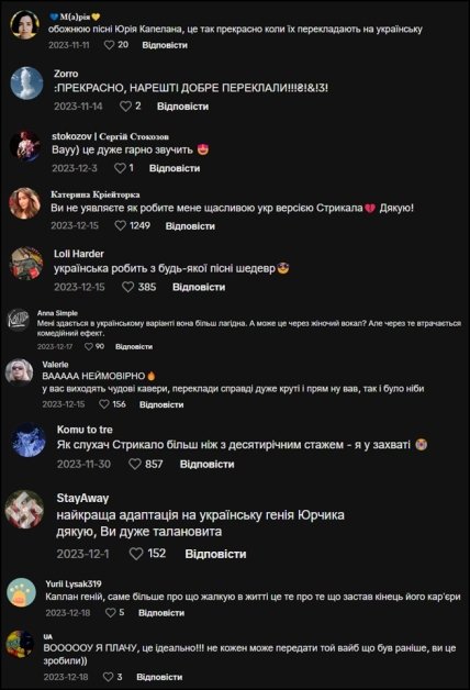 "Люблю пісні Каплана, це так чудово, коли їх перекладають українською", "Дуже добре звучить", "Нарешті добре переклали", "Ви не уявляєте, як робите мене щасливою укр версією Стрикала. Дякую!", "Українська робить з будь-якої пісні шедевр", "Як слухач Стрикала з більш ніж десятирічним стажем, — я в захваті", "Каплан геній, шкодую, що застав кінець його кар’єри", — серед іншого, пишуть у коментарях.
