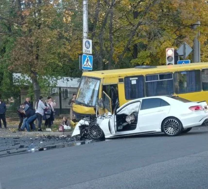У повідомленні не вказано, як саме сталася ДТП, проте на кадрах видно, що легковику повністю рознесло передню частину, а маршрутку теж сильно пошкодило.