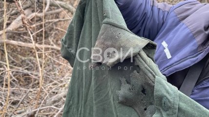 Біля тіла також виявили декілька елементів одягу. Вони порвані та вимащені бурою рідиною. Чи це кров, покаже експертиза. На місці також було знайдено футболку-поло захисного кольору. У виданні зазначають, що за кольором вона схожа на військову, а на рукавах та грудях є липучки.