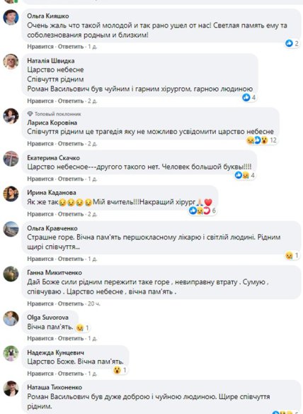 "Глибокі співчуття рідним і близьким Романа Васильовича. Рік тому він і мене врятував, зробив складну операцію, — згадує Ніна Каленіченко. — Як шкода, що так сталося. Він був найкращим хірургом з великої літери. Царство небесне! Вічна пам’ять! А рідним — здоров’я та сили пережити цей біль втрати".