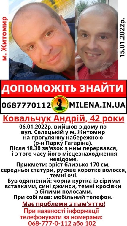 У Житомирі багато місяців шукали зниклого місцевого жителя Андрія Ковальчука, який вийшов із дому на прогулянку 6 січня та не повернувся.