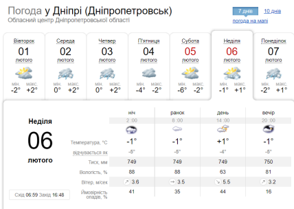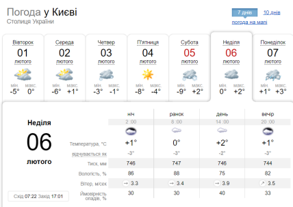 Що стосується завтрашньої погоди, то у середу, 2 лютого, в Україні вночі буде морозно: від -4 до -10 градусів, лише у південних областях, на Донеччині та Луганщині — близько нуля. У денні години температурні стовпчики піднімуться до -2…+3 тепла, лише на півдні буде по-справжньому тепло — до +7 градусів.
