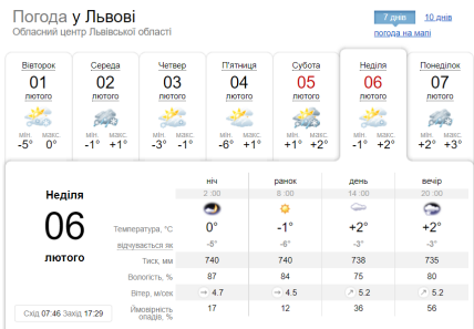 Жителям Львова синоптики обіцяють 6 лютого сонячну погоду, хмари з'являться лише ближче до вечора. Сніг також ймовірний, проте лише ближче до ночі та й той не сильний. Нічна температура повітря — -1, у денні години — +2.