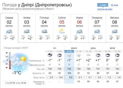 У Дніпрі 2 лютого вдень буде до +2 градусів, уночі температурні показники не опускатимуться нижче 1 градусу морозу. Весь день буде похмурим, йтиме мокрий сніг.