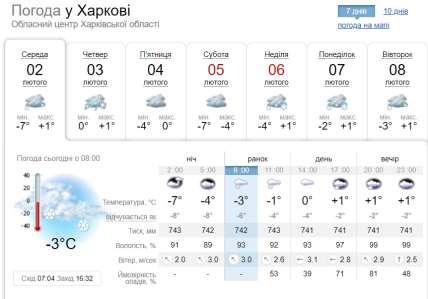 У Харкові буде хмарно. падатиме сніг увесь ранок та увечері. Температура повітря майбутньої ночі утримуватиметься на нульових позначках, вдень — +1.