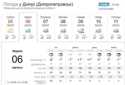 У Дніпрі сонце в цей день буде рідко з'являтися з-за хмар. Уночі очікується випадання мокрого снігу. Вранці, вдень та ввечері — без опадів.Температура: близько -2 в нічну пору доби, +1 — вдень.