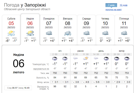 У Запоріжжі сонце виглядатиме лише вранці. Уночі очікуються опади у вигляді мокрого снігу. Температура повітря уночі утримуватиметься на показниках у -1 градус, вдень — стільки ж зі знаком "+".