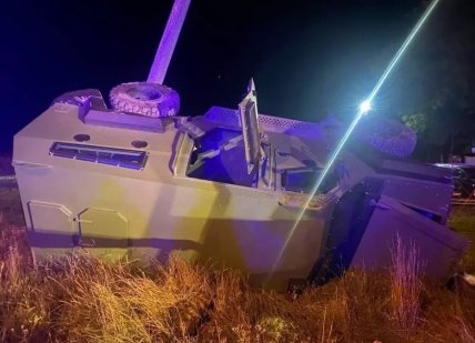 Водій військового броньовика попри те, що його транспортний засіб перекинувся на дах, не постраждав.