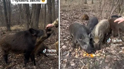 Відео з годуванням кабанчиків нині публікують у TikTok люди, які проїжджали дорогою Київ — Черкаси. У лісі в Черкаському районі вони побачили велике скупчення людей на узбіччі дороги. Як з’ясувалося, люди там постійно підгодовують групку ручних лісових кабанчиків. Ті постійно виходять до людей у цій ділянці лісу. Свою зустріч із дикими тваринами описала Олександра :