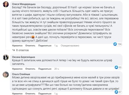 Новину розповсюдило одне з місцевих видань, зазначивши, що маму трирічної дівчинки покарають за безлад, і вказало розмір штрафу, який передбачено законом. Він може коливатися від 850 до 1700 гривень. Саме два ці моменти найбільше обурили коментаторів. По-перше, люди робили припущення, хто ж саме "заклав" жінку: сусіди чи невдоволені родичі, які могли захотіли насолити.