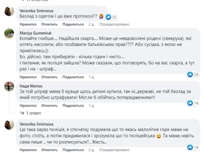 Коментатори також наголошували: можливо, родині просто потрібна допомога, а не покарання, використовуючи доволі жорсткі епітети щодо ювенальних поліцейських. Люди навіть тегали міського голову Кам’янця-Подільського, вимагаючи "припинити цей жах", а також закликали відгукнутися жінку, щоб напряму́ з’ясувати, яка підтримка їй з дитиною потрібна.