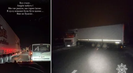Разом з тим волонтер і підприємець Віка Чайковська, яка потрапила в цю пробку, пише у своєму акаунті в Instagram, що дорога вкрилася льодом, через що "фури в кюветі і посеред траси".