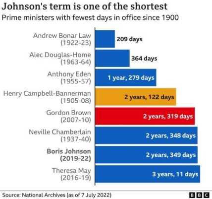 У разі, якщо Джонсон залишить посаду, термін його перебування в кріслі глави уряду Сполученого королівства виявиться одним із найкоротших за останні 120 років. За цим показником він обійде навіть свою попередницю Терезу Мей, яка протрималася на посаді 3 роки та 11 днів. На сьогодні цей термін для Джонсона складає 2 роки та 349 днів.