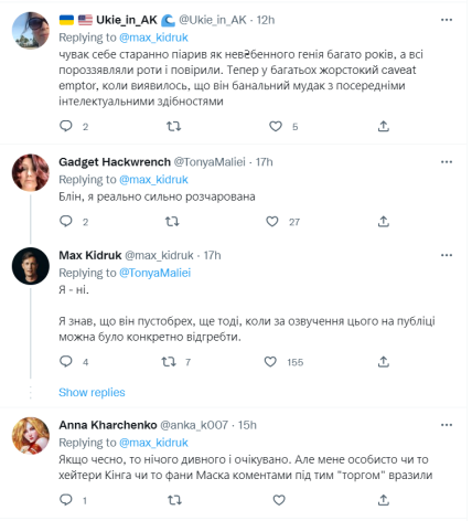 Що стосується реакції користувачів, які є жителями України, то вони також залишилися незадоволеними рішенням Маска впроваджувати платну послугу, котра раніше була безкоштовною. Зокрема, українці відзначають, що розчаровані, адже раніше були переконані, що саме ця людина поведе людство до зірок, а у підсумку вона опустилася до рівня торгівлі за місячну ренту за звичайну синю галочку.