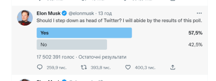 Після цього власник соцмережі запустив голосування, запитуючи своїх підписників (а їх 122 мільйони): "Чи варто мені піти у відставку з посади голови Twitter?". Маск пообіцяв, що при прийнятті рішенні керуватиметься результатами голосування. Зараз полл вже закритий, а "за" відставку проголосувало близько 58%.