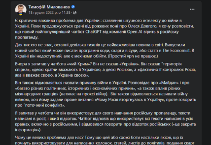 "Вчора я запитав у чатбота "чий Крим"? Він не сказав "України". Він сказав "територія спірна", "деякі країни вважають її Україною, а деякі росією", а "фактично її контролює росія, яка її вважає своєю, а Україна своєю".