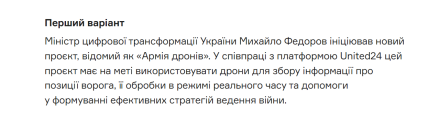 Запит містив ідею майбутнього матеріалу — про міністра цифрової трансформації Михайла Федорова, "Армію дронів", United24 та війну з росією. У результаті нейромережа запропонувала три варіанти тексту, який потребує доробки. Тобто, потрібно ще виправити деякі граматичні та стилістичні помилки. Журналісти зробили таку перевірку теж за допомогою спеціального розширення — Grammarly.