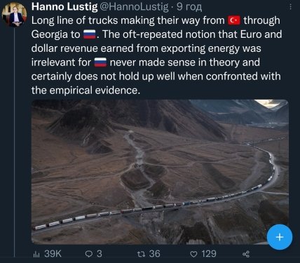 Незважаючи на допомогу Україні, Туреччина продовжує підтримувати відносини з росією, у тому числі торгові. Ханно Лустіг опублікував фото, на якому видно довгу низку вантажівок. Вони їдуть із Туреччини через Грузію до росії.
