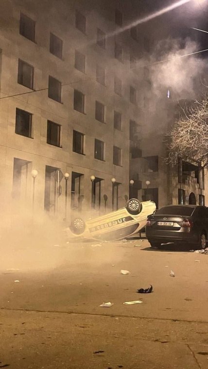 В інших місцях у Тбілісі протестувальники блокують транспорт силовиків і закидають його камінням та перевертають поліцейські автомобілі.