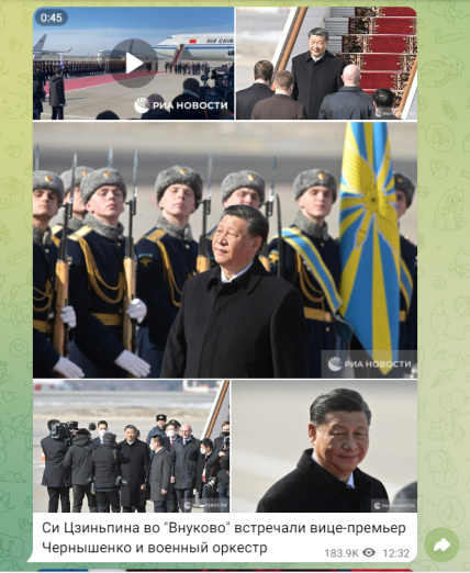 14:56 — у Георгіївській залі кремля відбулась церемонія офіційної зустрічі голови КНР із президентом росії. Після прогулянки довгими коридорами лідера Китаю та володимира путіна супроводжував оркестр, який виконав китайський та російський гімн.