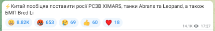 "Ми не бачили жодних доказів того, що Китай постачає летальну зброю до росії, але ми бачили деякі ознаки того, що це був запит з боку росії, і це питання, яке розглядається в Пекіні китайською владою… Китай не повинен надавати летальну допомогу росії. Це означало б підтримку незаконної війни", – попередив Столтенберг.