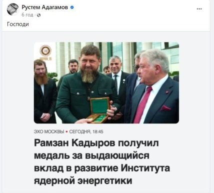 Відомий блогер Рустем Адагамов (drugoi), розмістив на своїй сторінці в соціальній мережі репост з пропагандистського ресурсу про те, що голові Чечні, який рветься в Бахмут, рамзану кадирову вручили медаль "за видатний внесок у розвиток Інституту ядерної енергетики".
