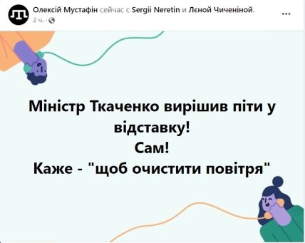 - А, то це не той міністр, не той Ткаченко. Приєднуйтесь, будь ласка, до петиції про відставку міністра безкультурності, поширюйте. Тому що цей, схоже, сам не піде. А часу на збирання підписів залишилося мало.