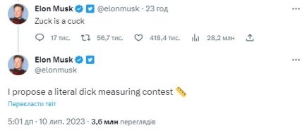 Протистояння між двома американськими мільярдерами — засновником Meta (Facebook, Instagram) Марком Цукербергом та власником Twitter Ілоном Маском — продовжується. Так після озвучування наміру провести бій в октагоні, Маск викликав Цукерберга ще й на змагання з виміру довжини статевого органу.