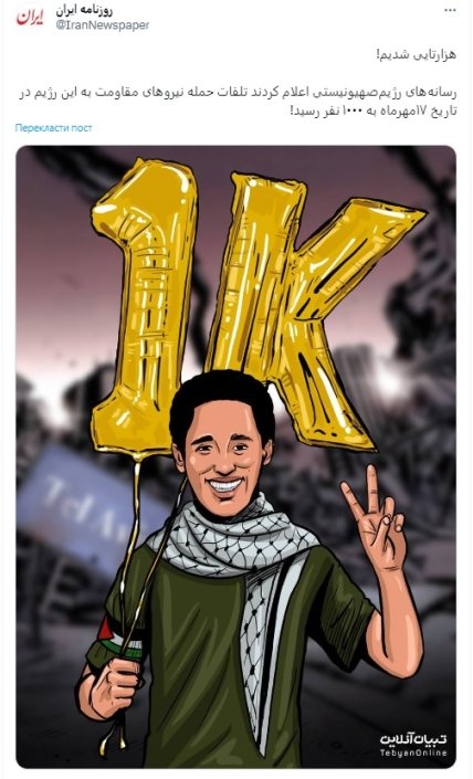 В Ірані урядова газета Iran Newspaper привітала читачів із тисячею загиблих ізраїльтян внаслідок нападу бойовиків ХАМАС. Повідомляється, що це дані станом на 7 жовтня.