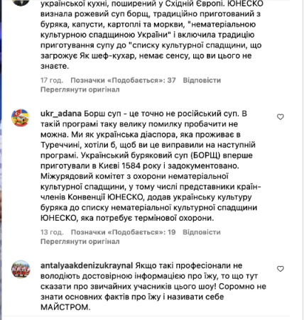 "Борщ — це точно не російський суп. У такій програмі таку велику помилку пробачити не можна. Ми, як українська діаспора, яка проживає в Туреччині, хотіли б, щоб ви це виправили на наступній програмі. Український буряковий суп (БОРЩ) вперше приготували в Києві в 1584 році і це задокументовано", "ЮНЕСКО визнала борщ, що традиційно приготований з буряка, капусти, картоплі та моркви, "нематеріальною культурною спадщиною України", "Борщ – суп України! Зробіть своє дослідження будь ласка! Ганьба вам", "З упевненістю можна сказати, що пахлава – не турецький, а грецький десерт", — пишуть коментатори.