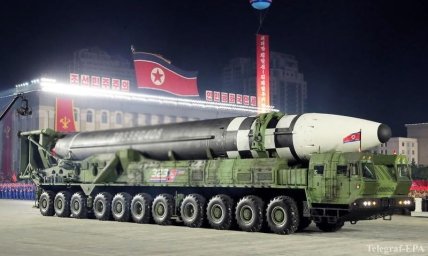 Найбільший ажіотаж в ЗМІ звичайно ж викликала нова балістична ракета, яка є продовженням серії Hwasong. Її прокотили по Пхеньяну на масивному шасі з 11 осями.