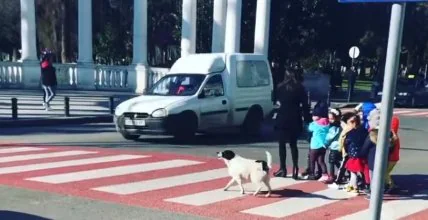 Коли діти йдуть пішохідним переходом, пес з гавкотом кидається на автомобілі.