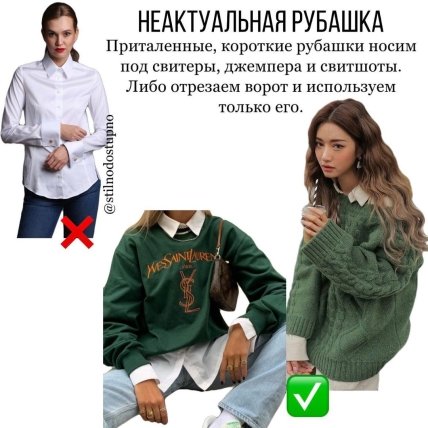 Приталені, короткі сорочки носимо під светри, джемпери та світшоти. Або відрізаємо воріт і використовуємо лише його.