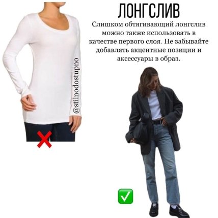 Занадто обтягуючий лонгслів можна використовувати як перший шар. Не забувайте додавати акцентні позиції та аксесуари в образ.